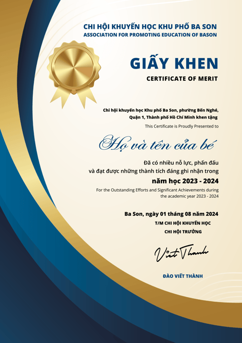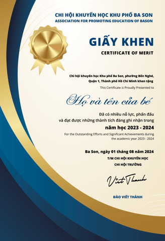 With a strong commitment to Foster a Love of Learning of students aged 6-18 who are living in Vinhomes Golden River and Grand Marina Saigon (Bason Quarter, District 1, Ho Chi Minh City, Vietnam), Association for Promoting Education of Bason warmly invites parents and students to receive a Certificate of Merit in recognition of students' efforts during the academic year 2023-2024.